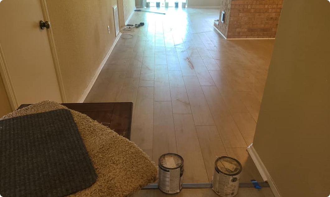 In this interior renovation project, premium wood flooring was meticulously installed to elevate a standard hallway and living area into a warm, inviting, and modern living space. The project began with thorough preparation of the subfloor, which was leveled and cleaned to ensure a stable foundation and prevent future shifting or creaking. High quality hardwood planks were then laid in a precise, uniform pattern that enhances the natural flow of the home’s layout. Careful attention was given to detail, with seamless transitions between rooms and expertly executed cuts around walls, corners, and fixtures to create a clean, professional finish. The result is a durable, elegant surface that adds both beauty and long term value to the home.
